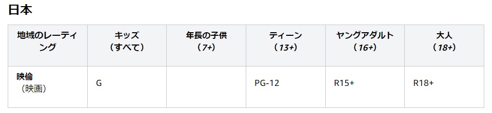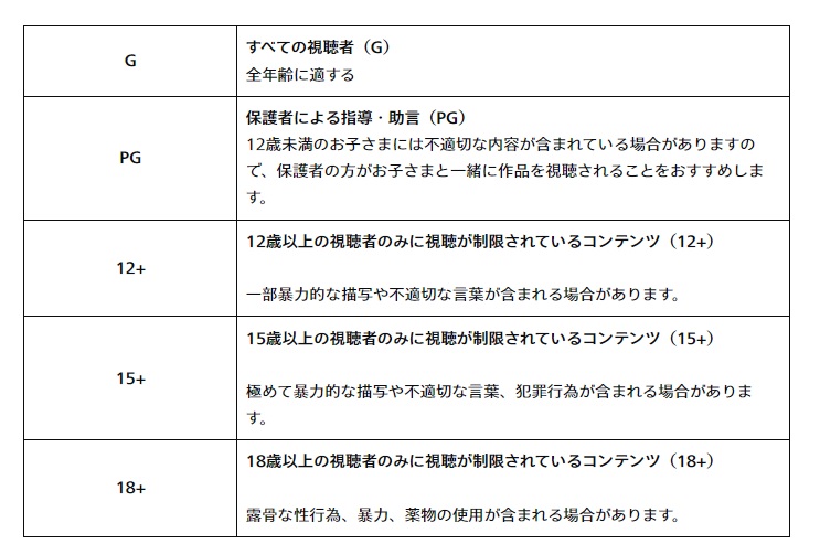 Prime Videoでは【G】(=すべて)、Disney+では【PG】(=保護者による指導・助言)、というレーティングが設定されています。